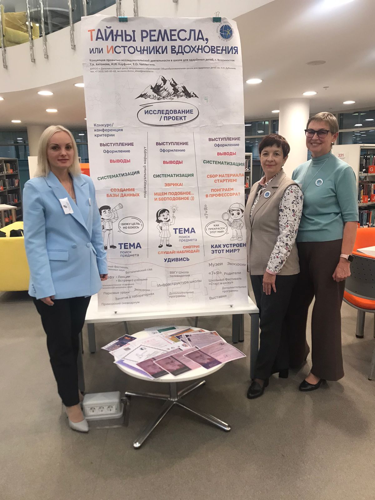 В рамках стендовых выступлений был представлен доклад наших учителей – «Тайны ремесла, или Источники вдохновения». Концепция проектной и исследовательской работы в школе для одаренных детей им. Н.Н. Дубинина». Выступление нашло живой отклик участников. Кроме вопросов по содержанию, слушателей интересовали проблемы организации мотивационной среды, общего устройства нашей школы, её особенностей. Участие в конференции дало возможность заявить о школе как о площадке общественного движения «Исследователь», подготовить условия для проведения в ШОД региональных туров Всероссийского конкурса исследовательских работ и творческих проектов дошкольников и младших школьников «Я – исследователь», «Тропой открытий В.И. Вернадского» и Всероссийского конкурса юношеских исследовательских работ имени В.И.Вернадского, которые состоятся в конце января – феврале 2026 года