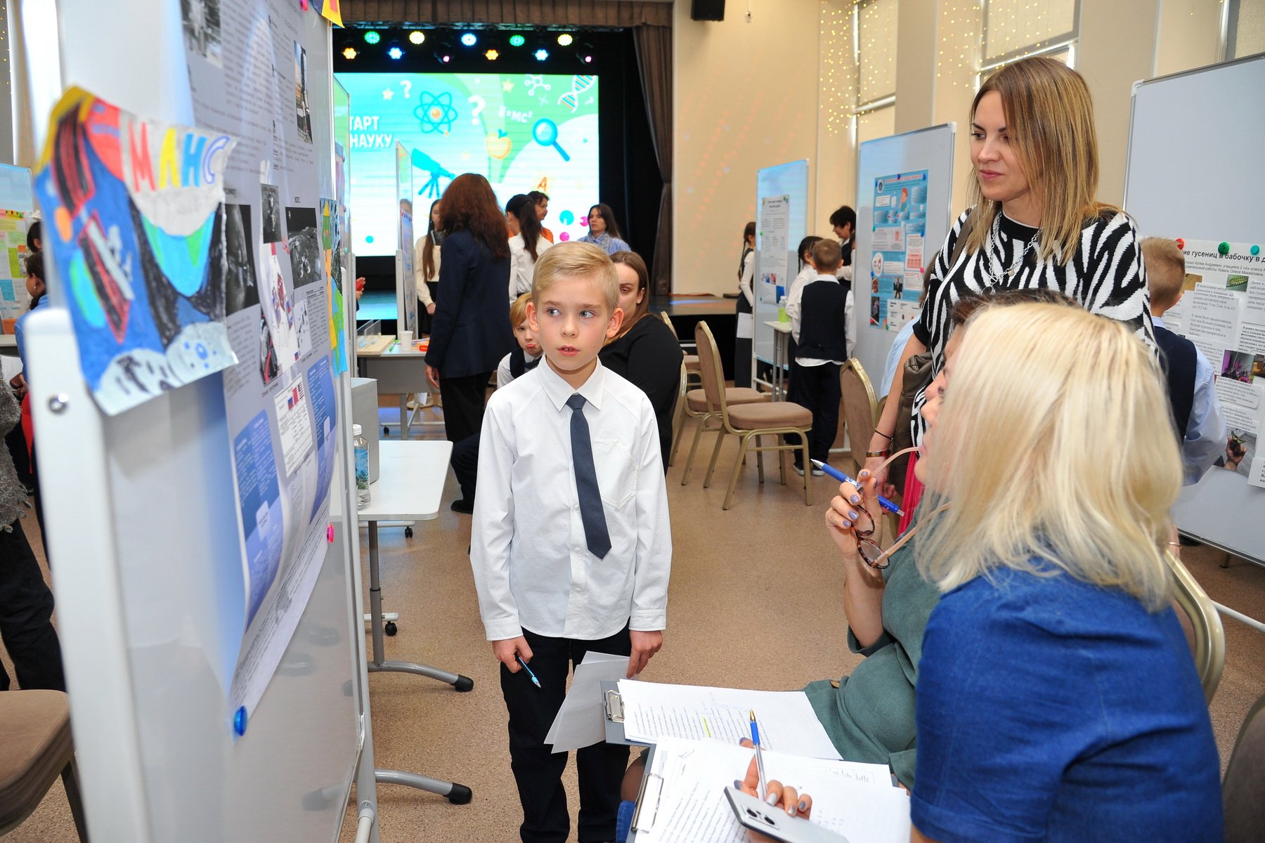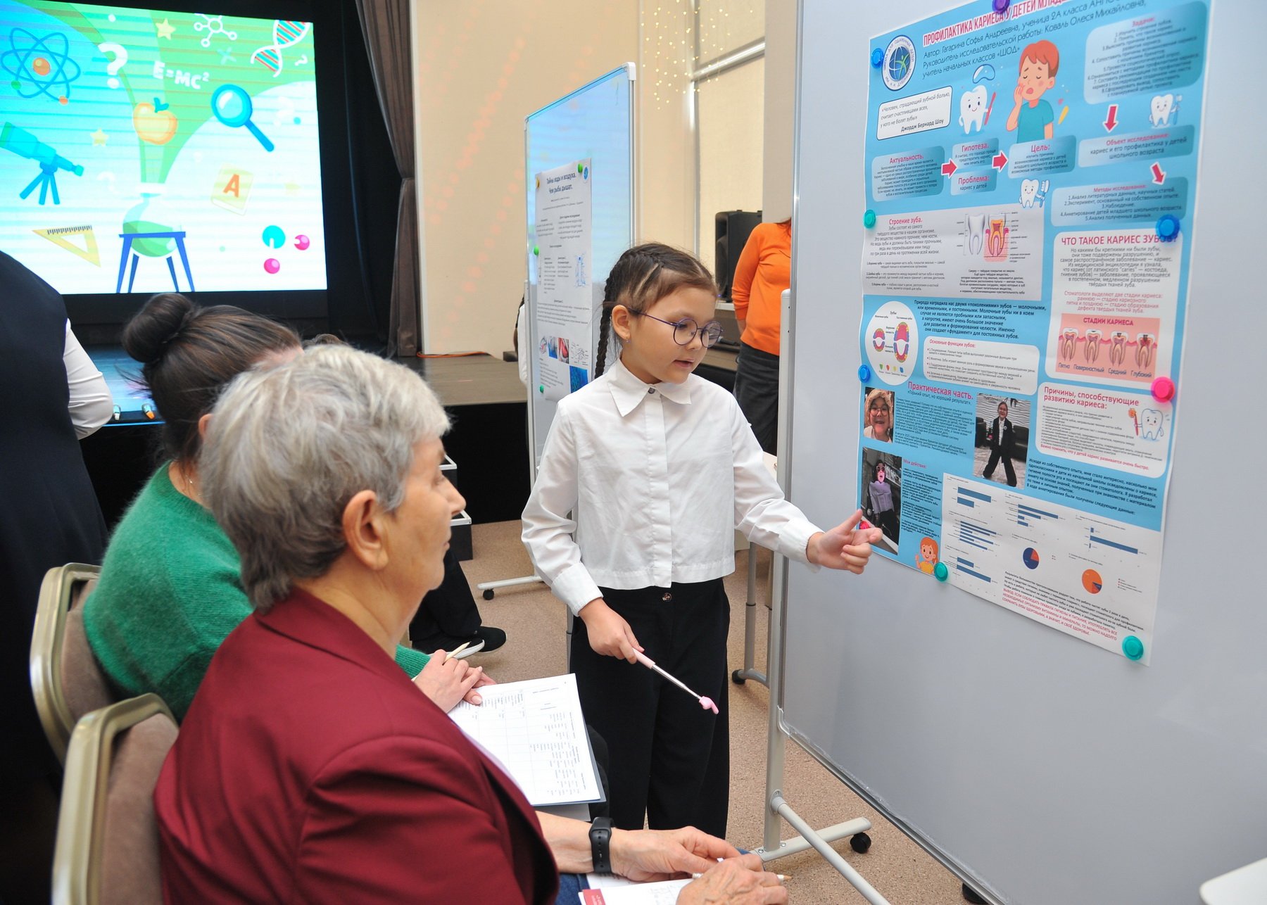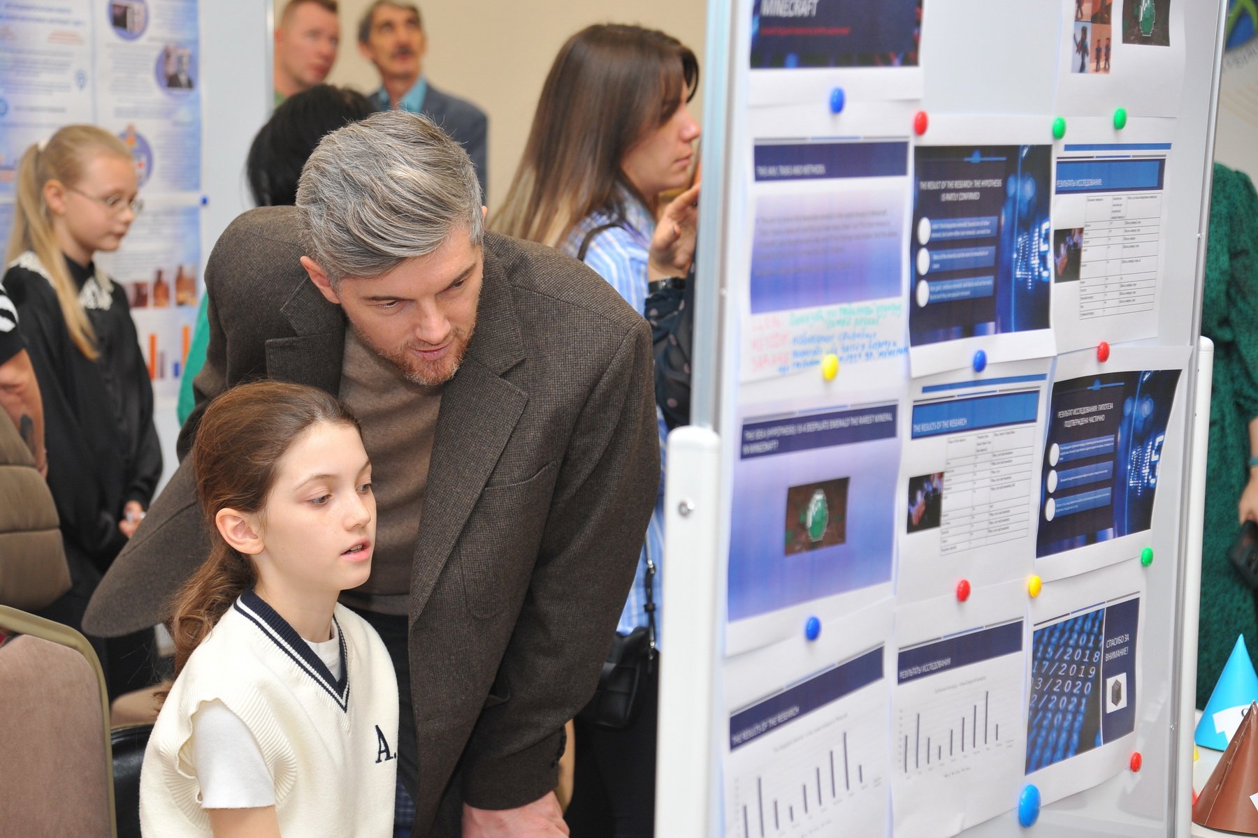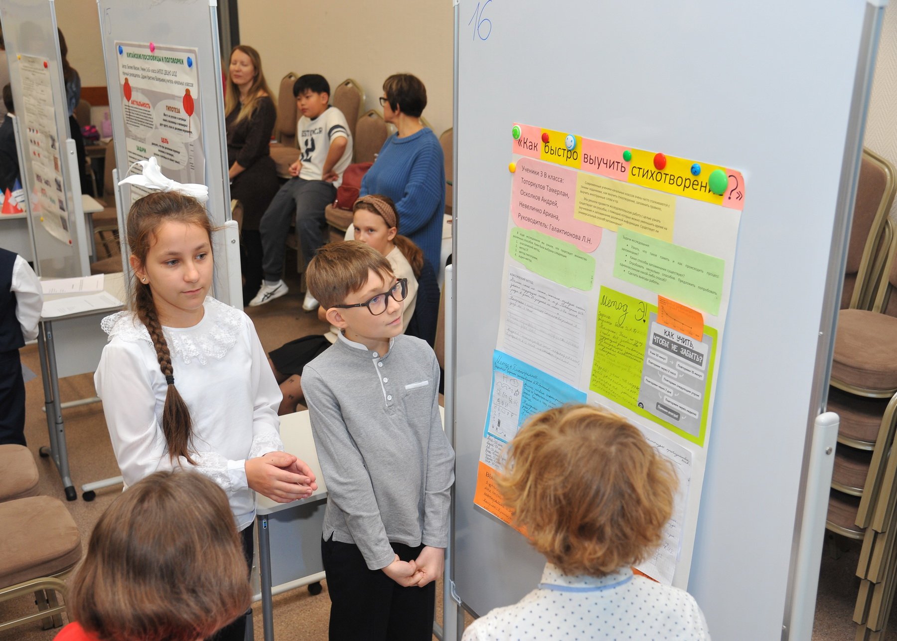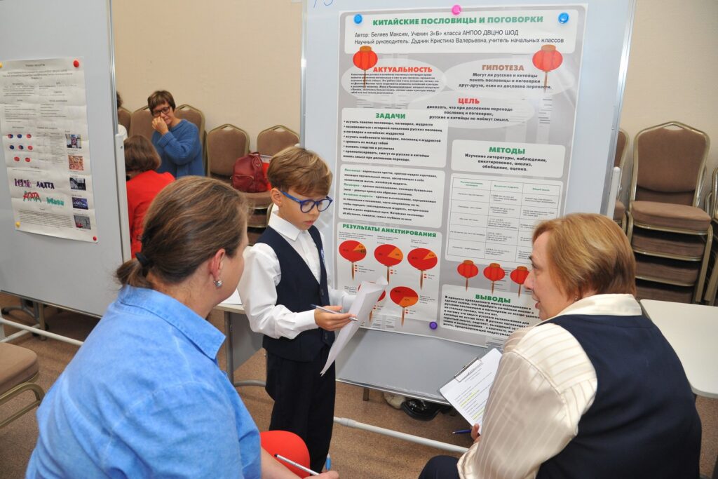 После окончания своей защиты ребята смогли познакомиться с работами других участников и отметить наиболее понравившиеся. В номинации «Приз зрительских симпатий» победили ученик 2А класса Юманов Георгий с темой о шахматах и ученик 4В класса Ким Енджун с темой о самом редком минерале в игре Minecraft.