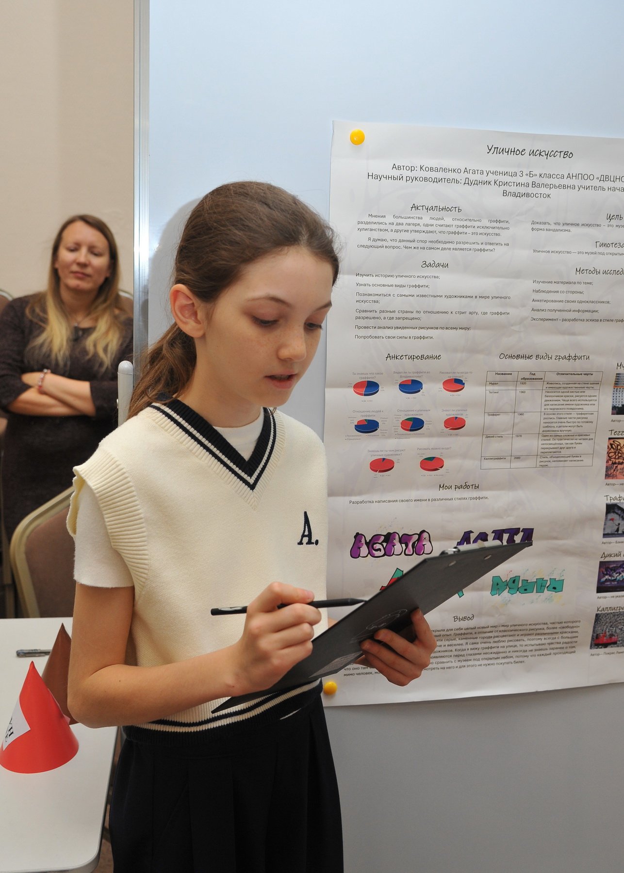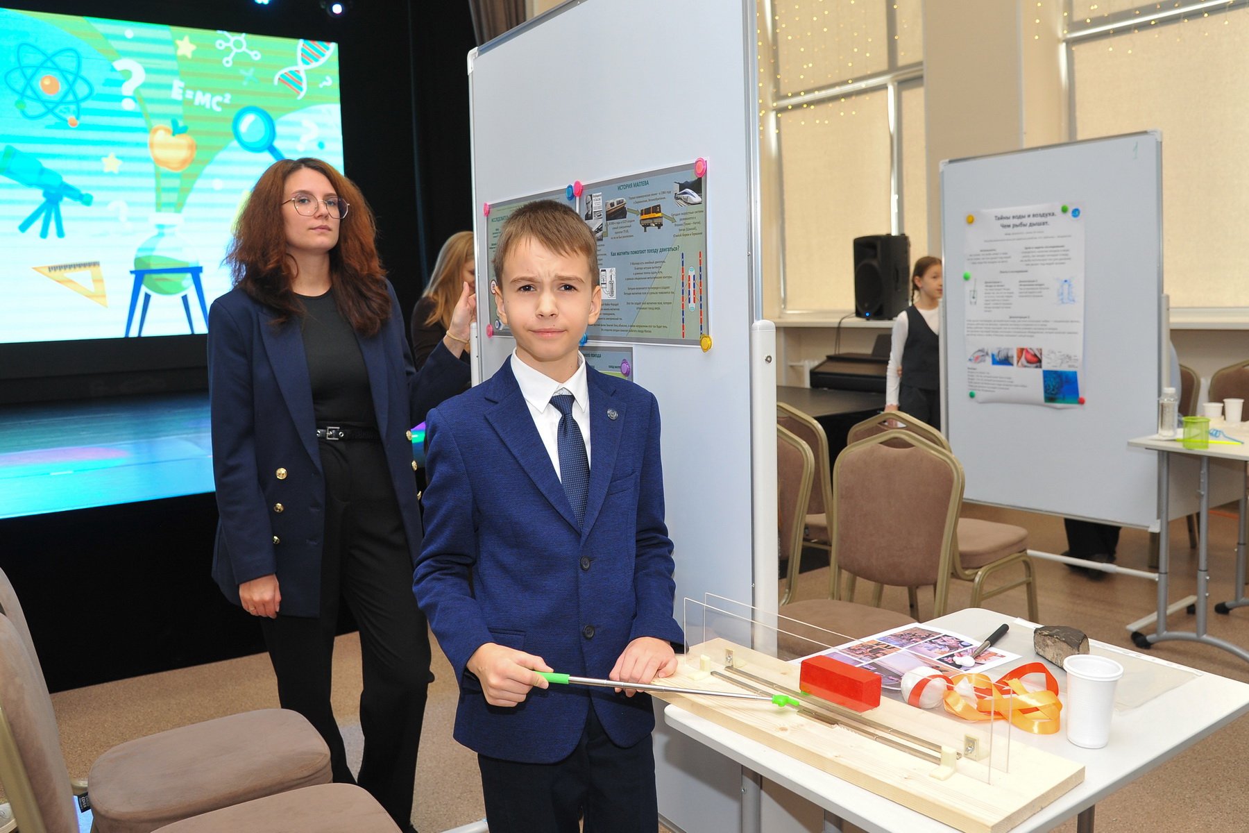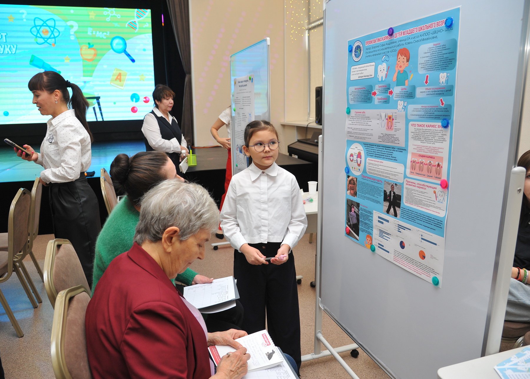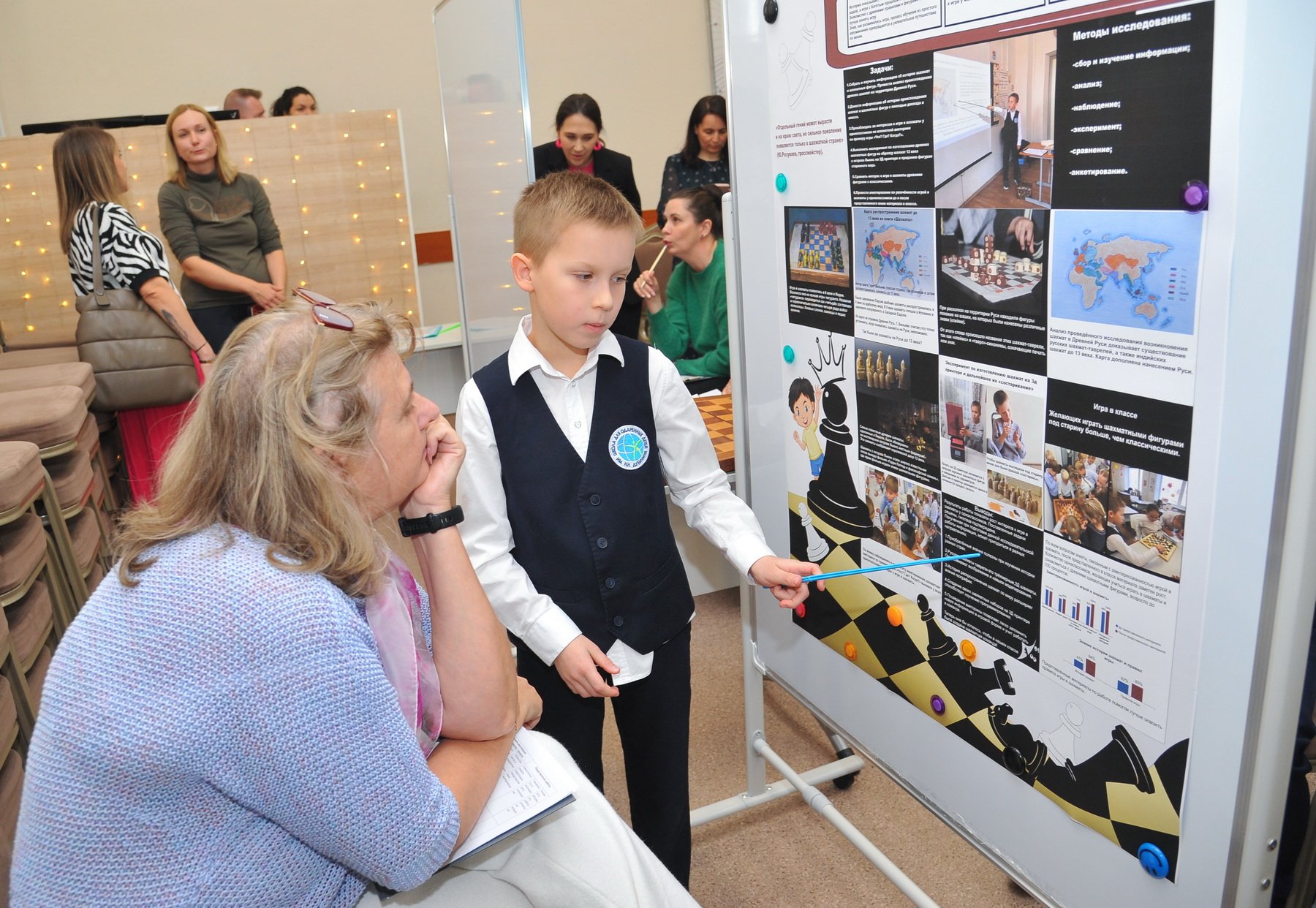 После окончания своей защиты ребята смогли познакомиться с работами других участников и отметить наиболее понравившиеся. В номинации «Приз зрительских симпатий» победили ученик 2А класса Юманов Георгий с темой о шахматах и ученик 4В класса Ким Енджун с темой о самом редком минерале в игре Minecraft.