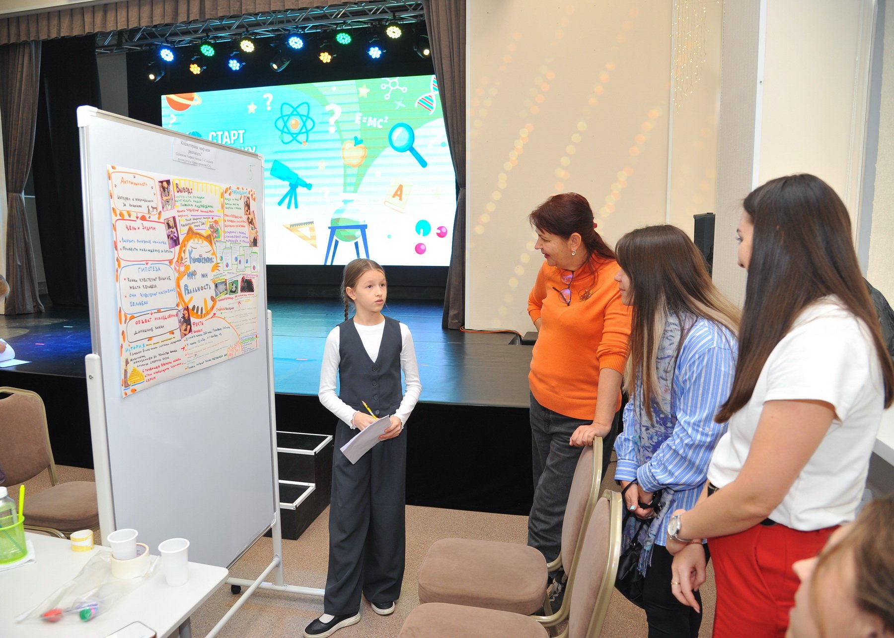 В этом году особенностью проведения конкурса стал новый формат представления работ – стендовая защита. И ребята, и наставники очень волновались и переживали получится ли в полной мере представить свои исследования в новых непривычных условиях. Тревоги были напрасны — обновлённый конкурс удался на славу! Актовый зал буквально кипел от живых, искромётных, невероятно интересных и познавательных выступлений наших юных исследователей.