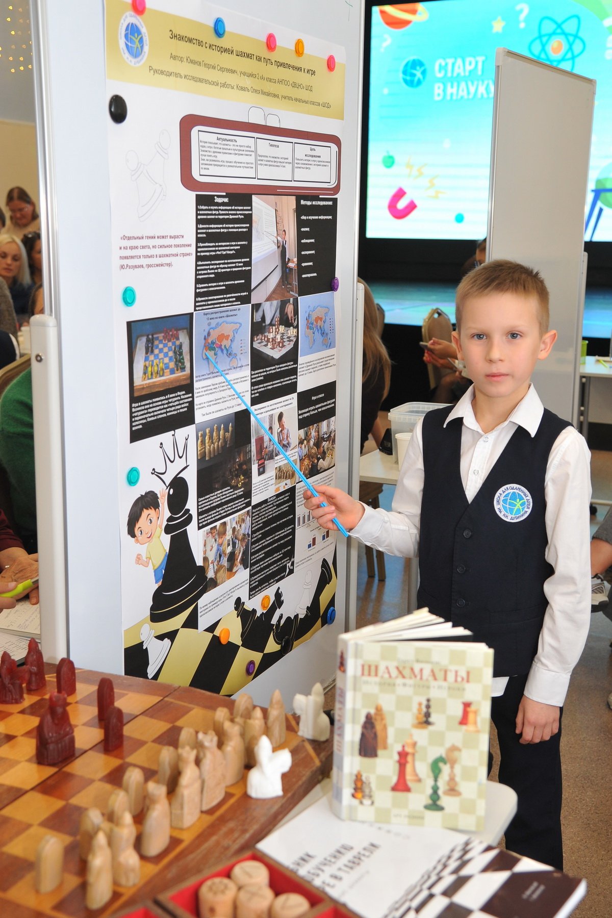 I место — ученик 2А класса Юманов Георгий, тема «Знакомство с историей шахмат как путь привлечения к игре» (руководитель Коваль О.М.)